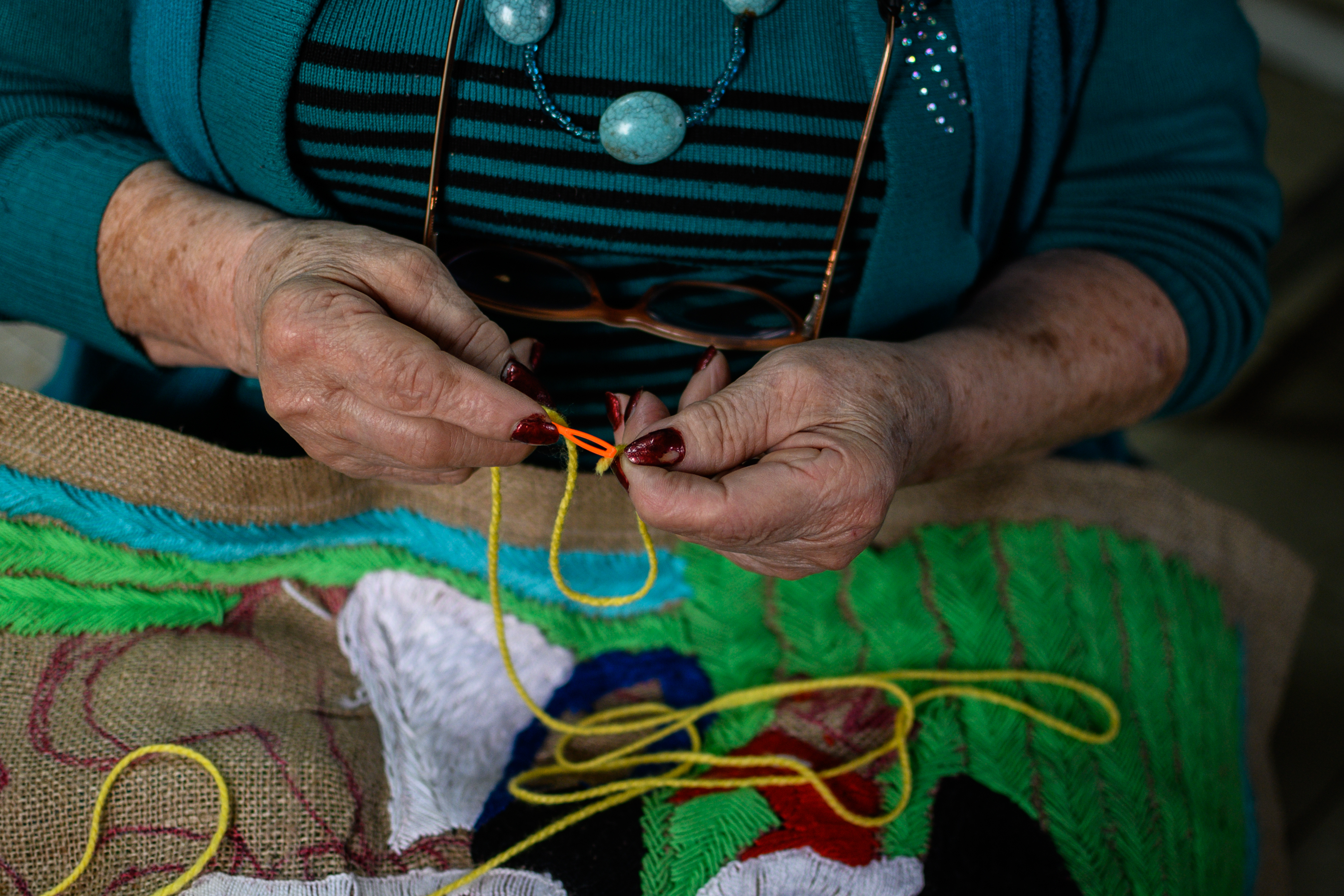 Audolina Orellana Troncoso,nació en Valle Simpson el 20 de abril de 1942, después se trasladó a la cuidadde Cochrane donde ha vivido desde entonces. Los abuelos de la señora Audolinallegaron del norte, su abuelo era de Los Ángeles y su abuela de Río Bueno yrecuerda que éstos se vinieron después de la guerra. “Después que mi abuelovolvió de la guerra, mi abuela tenía dos bebés, dos chiquititos, mi abuela erajovencita, mi abuela era alemana. (...) De ahí se vinieron ellos por laArgentina, porque mi abuelo tenía harto capital, entonces se vinieron por laArgentina, salieron por los Andes dieron la vuelta, demoraron, en 3 años, 4años llegaron a Balmaceda en 1905, mi papá nació el 14’, nació en Balmaceda, elaño 14’, ya mi abuela tenía... también ellos eran 14 hermanos” (A. O.). Supadre, como cuenta, nació en Balmaceda, aventurero y amante de las carreras decaballo, se asentó en Valle Simpson junto a su familia y después de estar ahíun tiempo decidió irse al sector del Baker. La señora Audolina, viene de unafamilia de diez hermanos, todos criados en el campo, lugar donde aprendió desdelos 7 años a bordar, tejer y curtir cuero, además de todas las tareasdesarrolladas por los hombres como carnear un animal, enlazar y todas lastareas necesarias para vivir en el campo de la región de Aysén. Nos cuenta quecuando vivió ahí, mientras los hombres jugaban truco ellas bordaban a la luzdel candil, para hacer más cortas las noches de invierno. Trabajó doce años enla cárcel de Cochrane, en la cocina, después se compró una máquina para tejer,sin saber cómo funcionaba, la mandó a encargar a Japón, una vez que llegó sumáquina, aprendió a tejer con ella, vendía chalecos a todo el colegio, le fuebastante bien, así que después se compró una máquina de coser industrial. Laseñora Audolina, se casó en 1962, un 20 de octubre con don Eulogio Gallardo, decuyo matrimonio nacieron 4 hijos, Nelson, Celso, Ada y el mayor de sus hijos,que no tuvo nombre ya que falleció de bronconeumonía al trasladarlo de Cochraneen avioneta para llevarlo al hospital de Chile Chico. Hoy en día, la señoraAudolina trabaja en casa, vive de la curtimbre de cueros, un trabajo que cadavez es menos practicado, siendo ella una de las pocas mujeres que curte cueroen la zona del Baker.