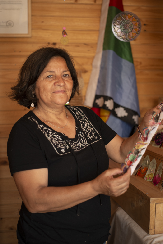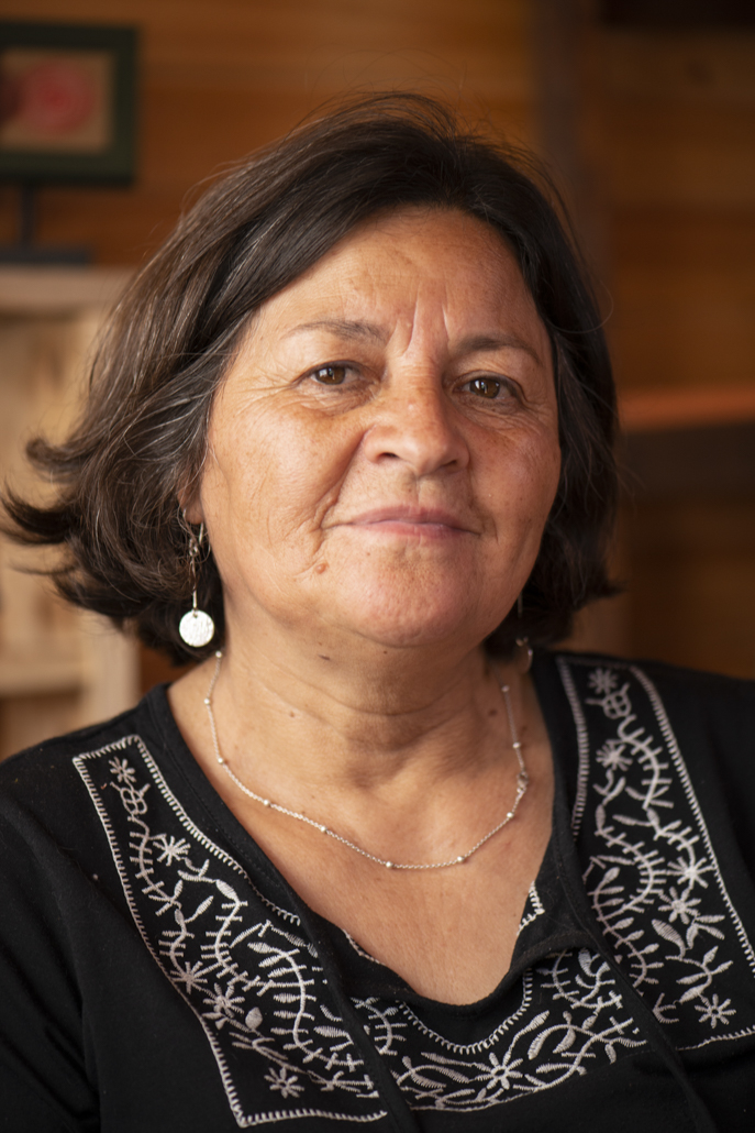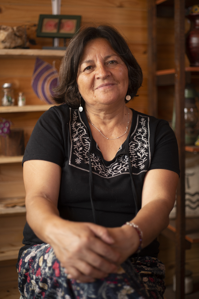 Artesana, amante de los animales y solidaria con su comunidad, son valores que reconoce que aprendió de su madre. Lleva muchos años trabajando en la Junta de Vecinos, de la que hoy en día es su presidenta, le gusta ayudar a las personas y estar a disposición de la comunidad de Rari. Cuando niña aprendió a tejer durante cada tarde que acompañaba a su mamá Dina Muena Sepúlveda, sagradamente iba a tejer con su comadre, la tía Silvia Retamal, a las cuatro de la tarde en punto se sentaban ambas mujeres a tejer, y ella junto a su prima se escabullían entre el brasero y las faldas para hacerse de algunas hebras de crin y poder copiar lo que hacían las mujeres. Recuerda que en esos años era difícil conseguir pelos de caballo, eran escasos y caros, por lo que cada hebra era bien preciada. Así fue como aprendió junto su prima, mirando, nunca les enseñaron a tejer. A los 11 años tuvo que migrar con su familia cerca de Talca, trasladaron a su padre por trabajo. Vuelve a los 17 años a la localidad sin prestar mayor atención al tejido, teje de vez en cuando. Un día se dio cuenta que podría ganar dinero con las ventas de sus tejidos para apoyar a sus hijos en los estudios, eso la motivó y retorno a la artesanía. Fue así como se acostumbró a tener su independencia económica por lo que siguió tejiendo hasta la actualidad. Se dedica a enseñar a las nuevas generaciones en la Escuela de Artes y Oficios Ayekantun que hoy en día existe en la localidad. También trabaja de tallerista en la Cámara de Ecoturismo y Artesanías Colbún.