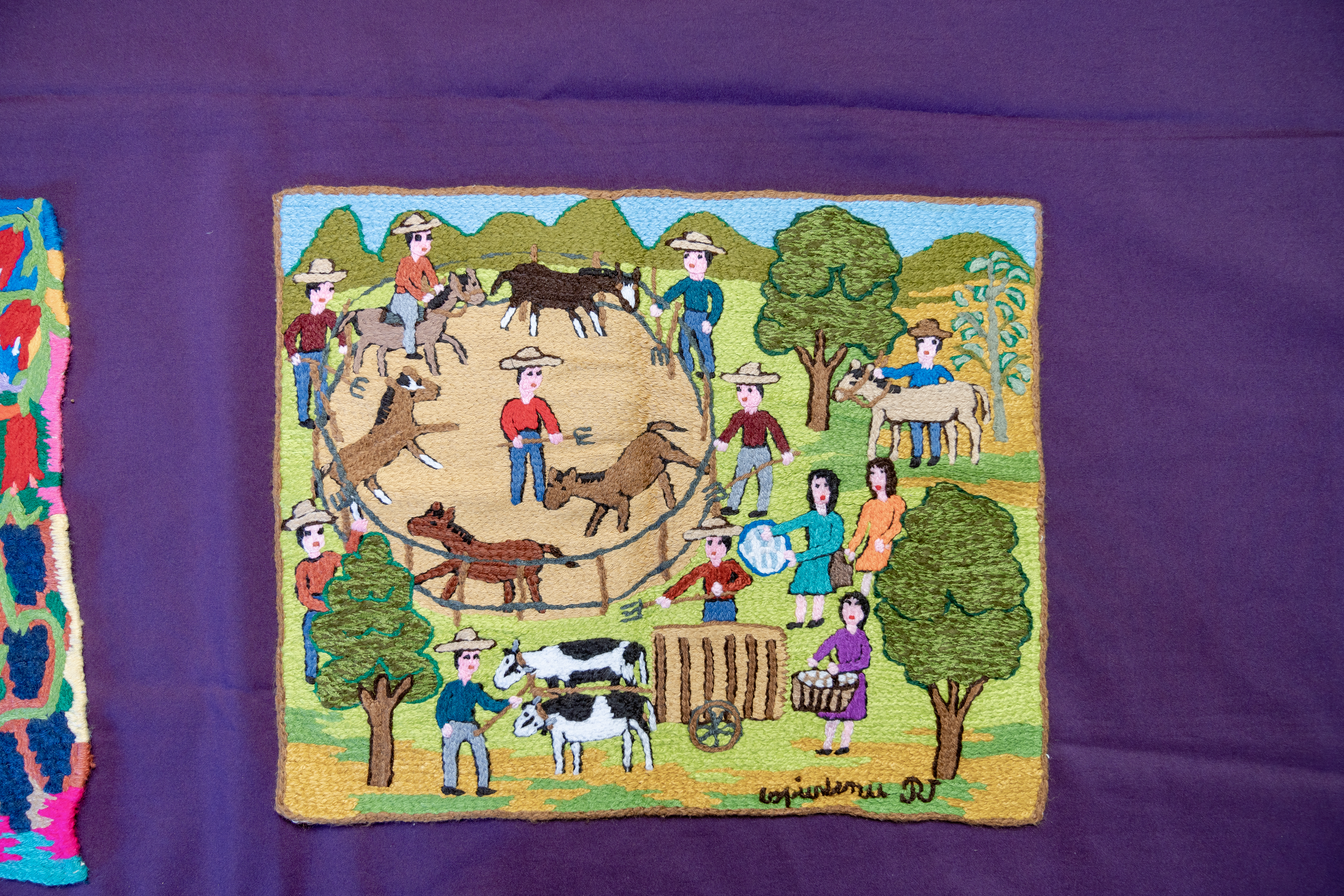Con 38 años de trayectoria, ha plasmado en sus paños escenas rurales como trillas, huertos, bosques, animales y labores del campo, recuperando recuerdos íntimos de su vida campesina. Ha transmitido sus conocimientos a nuevas integrantes —especialmente jóvenes y mujeres que buscan aprender el oficio— participando activamente en actividades educativas, talleres y demostraciones organizadas por la agrupación.