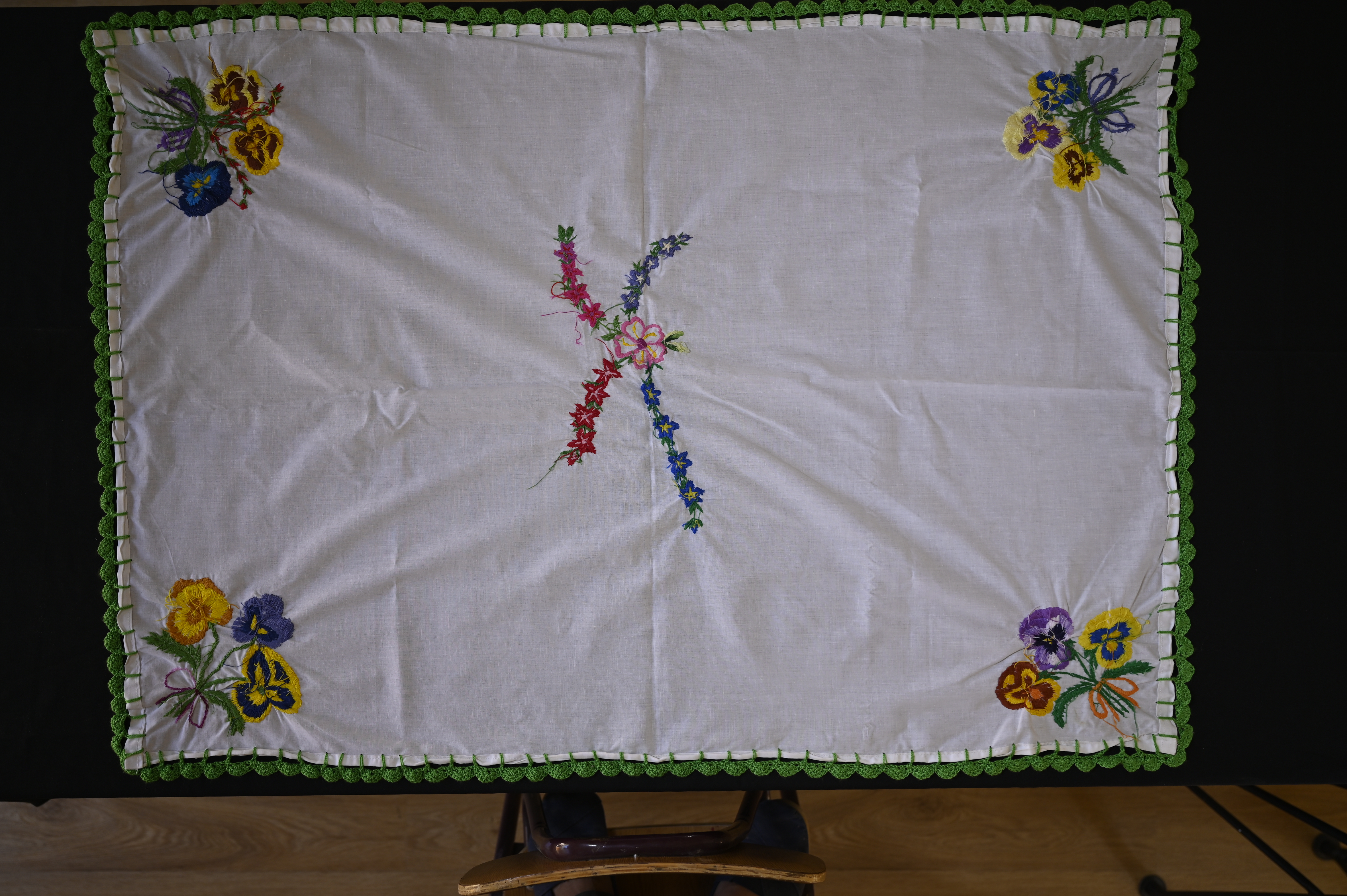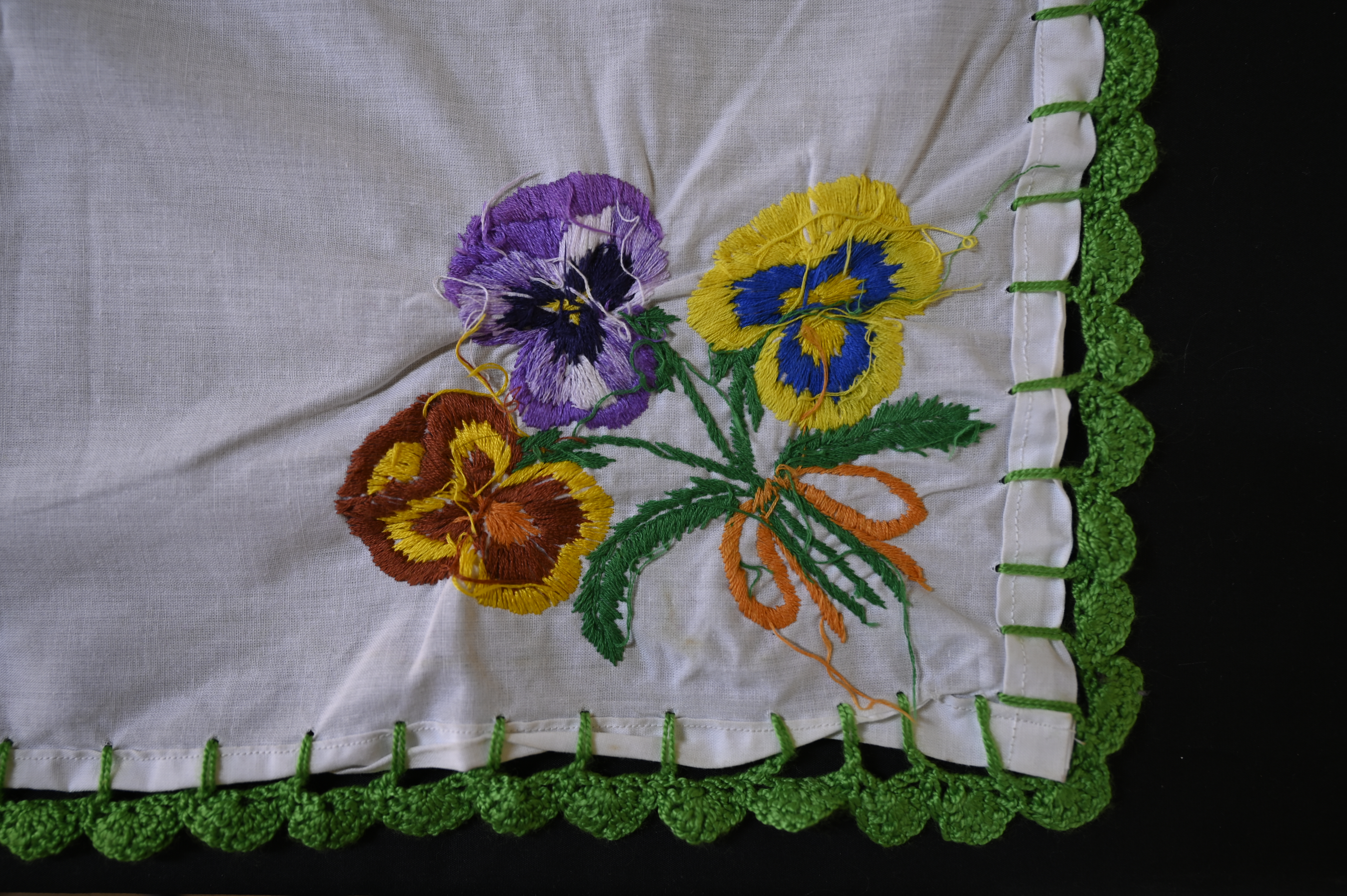 Sus flores favoritas son los pensamientos, los cuales observa en su jardín para inspirarse. Describe cómo contempla sus colores cuando están en flor y luego los lleva a la memoria para reproducirlos en el paño a través del bordado.