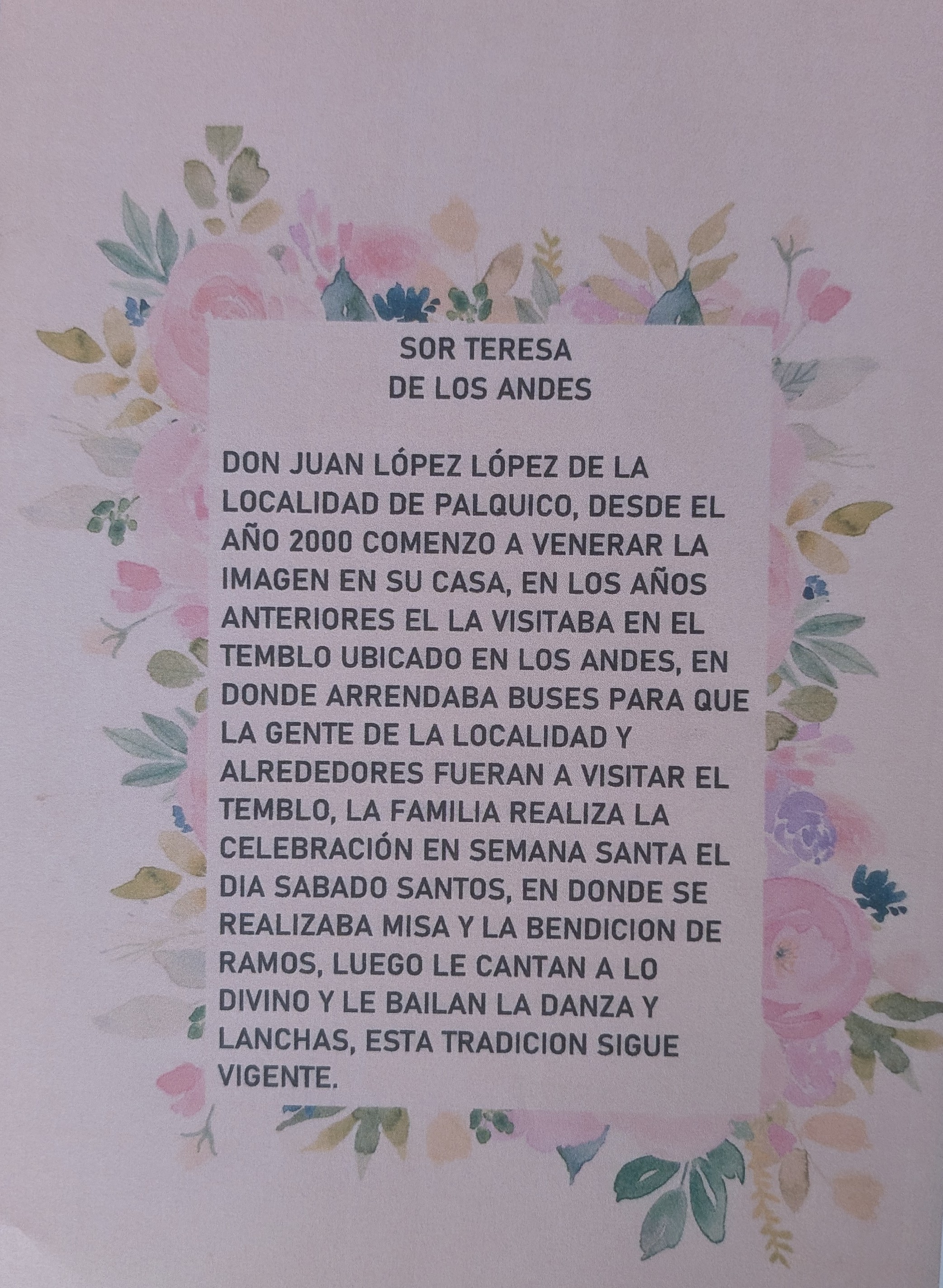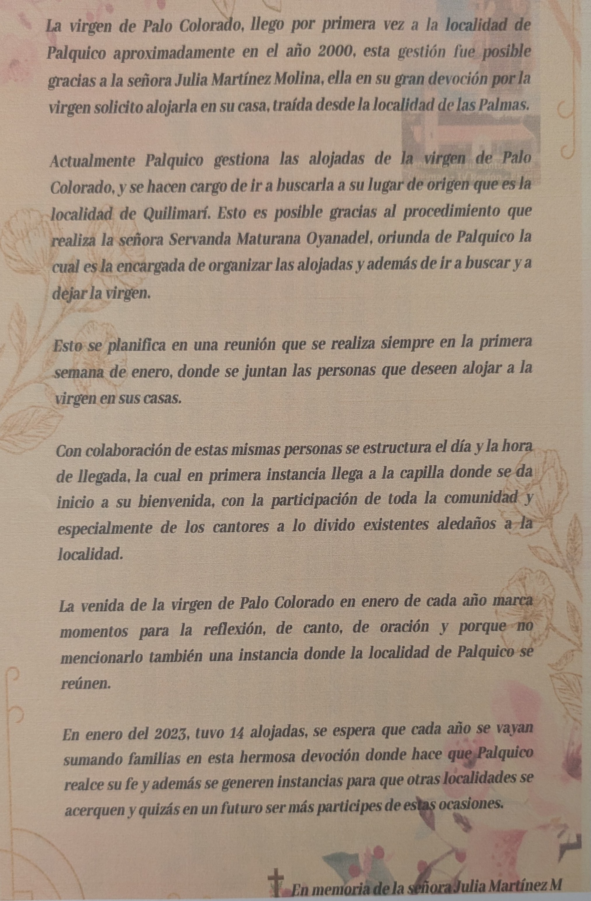 Hace como diez años que yo practico esto, yo esto lo aprendí por necesidad, porque traíamos una imagen de Palo Colorado todos los años, entonces se invitaban cantores de Cabildo, pero por problemas de vehículo u otras razones no podían venir, entonces nos quedábamos ilusionadas, con pena, con rabia porque ellos daban con realce con Canto a lo Divino a la fiesta. Entonces un día yo agarré un libro, en ese entonces yo era apoderada del colegio Teresita de Los Andes, y un niño tocó la guitarra, y ahí mucha gente me dijo “oh, qué linda la voz”. Yo me sé tres versos no más, por eso tengo que tener un libro en mis manos para cantar, porque si no se me olvidan. Entonces, prefiero tener el cuaderno o el libro en las manos, pero gracias a dios tomo muy fácil las entonaciones. Eso me facilita harto las entonaciones; pero yo me sé tres versos, el primer verso que me aprendí era uno que cuenta la historia de la virgen de acá, de Quilimarí. Así es nuestra tradición, lo hicimos por necesidad. Luego se incluyó a esto María Aravena y Valentina, que es una lolita de 17 años que también canta. Yo también rezo el rosario y ayudo a cantar al angelito o al difunto adulto.