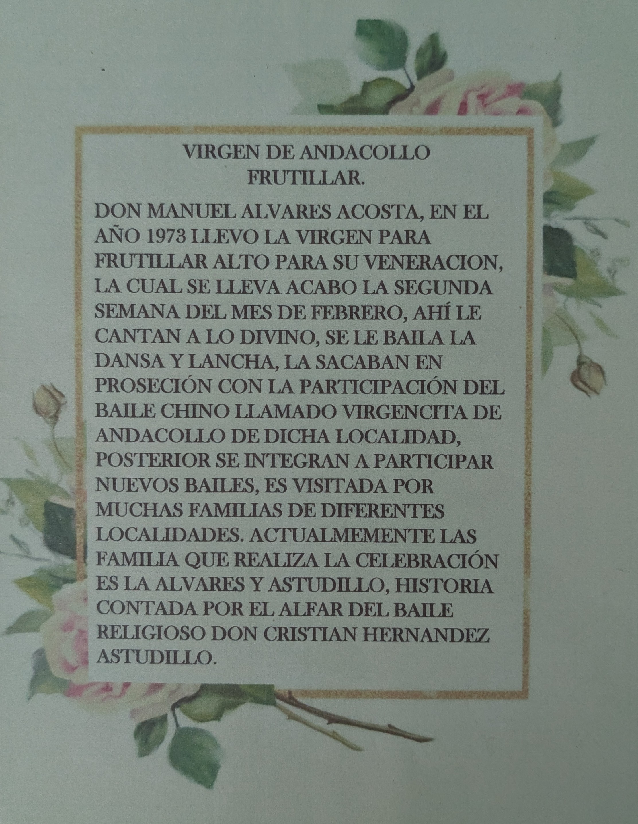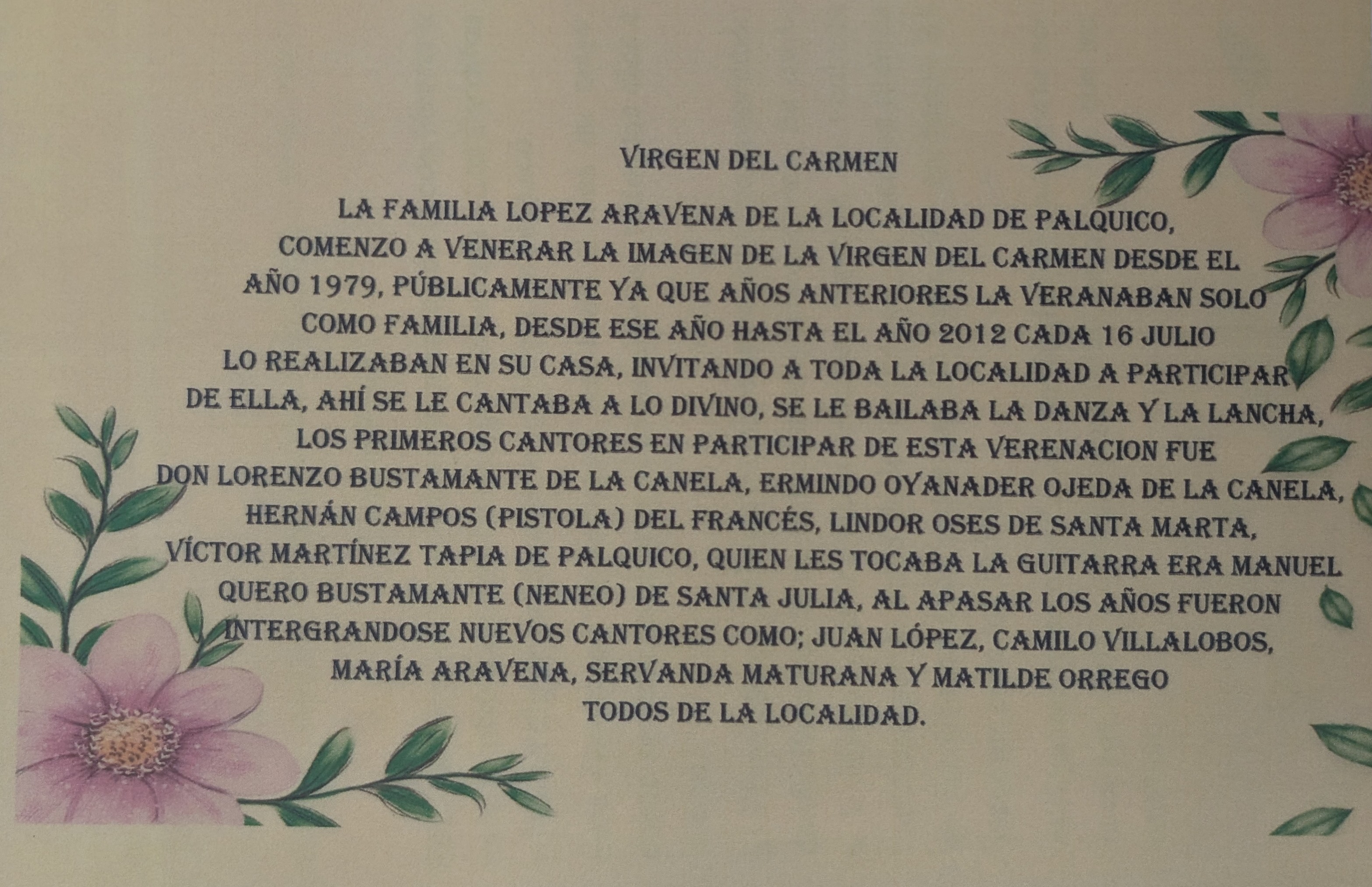 Yo trabajo en un jardín infantil, y acá hicimos un PMI, un mejoramiento a la infancia. Yo les enseñé a los niños el verso de la virgen, y los niños se aprendieron más de la mitad del verso. Y fue emocionante, porque yo les tocaba la guitarra y ellos cantaban. Acá hay mucha gente que baila la danza y la lancha, son dos cosas tradicionales a la virgen.