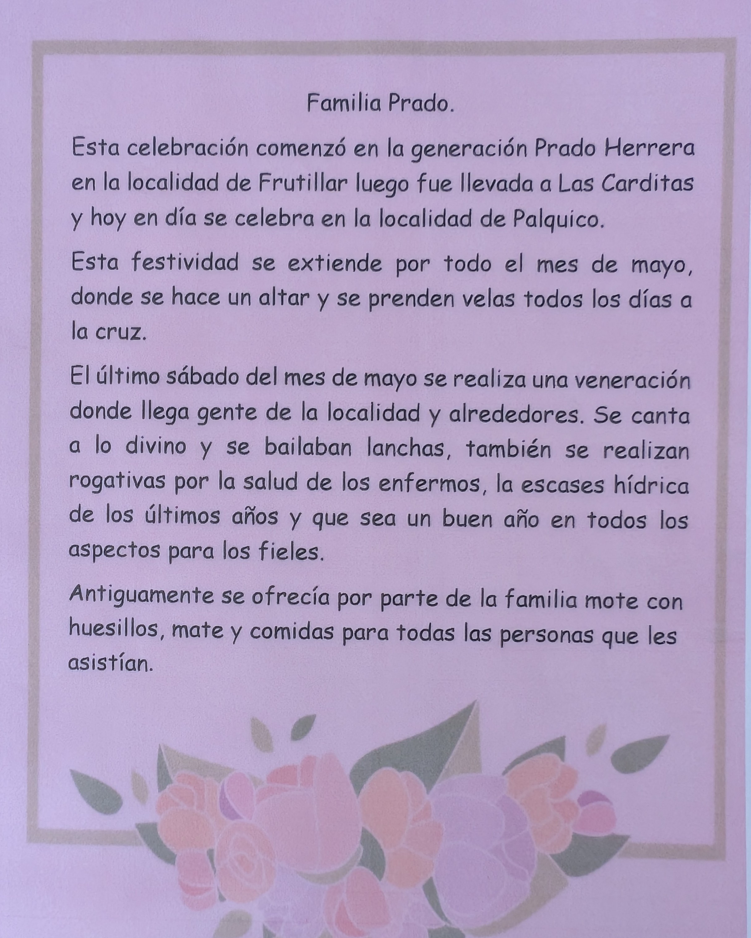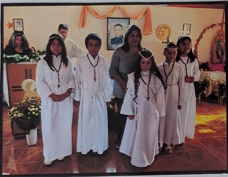 Para mí saber todo esto es un orgullo de mis padres porque gracias a ellos me incentivé a llevar esta tradición, ellos me lo inculcaron de chica, con el hecho de llevarme a participar; a pesar de que mi padre era muy egoísta para cantar. Tenía una entonación muy linda, y esto uno se lo lleva. Esto es algo que nace de uno. Yo acá estoy a cargo de la iglesia, preparo primera comunión, preparo confirmaciones. Y yo cuando tuve un grupo bueno de niños —porque acá también llegan niños de la cuarta región— celebramos el día de la virgen del Carmen y también la asunción de la virgen María. Y acá yo los incentivé a que bailaran lanchas, y todos bailaron. Es muy lindo, la gente me incentivó harto.