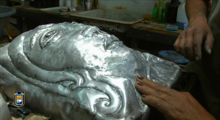 Los materiales que usa para darle forma al repujado son el cobre, bronce, aluminio, fierro, alpaca y plata. Usa sopletes con los que tiene que quemar los metales al rojo, una y otra vez para que vuelvan a ser maleables, ya que con los golpes se endurecen. Este proceso involucra mucho tiempo y es una de las razones por las que nadie realiza este arte en gran parte del país.