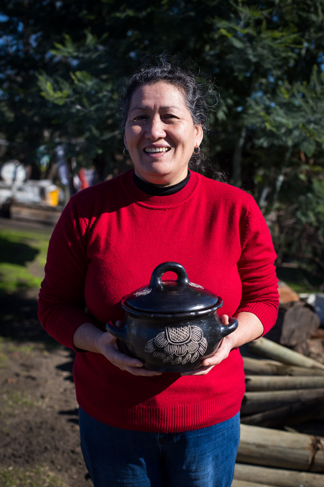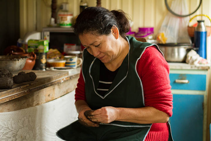 Conoce y maneja las distintas etapas del proceso de producción de las piezas, desde la obtención de las materias primas una vez al año en colaboración con su esposo, hasta la confección final. Generalmente vende todas las piezas que produce en distintas ferias y exposiciones, tanto a nivel local como nacional.