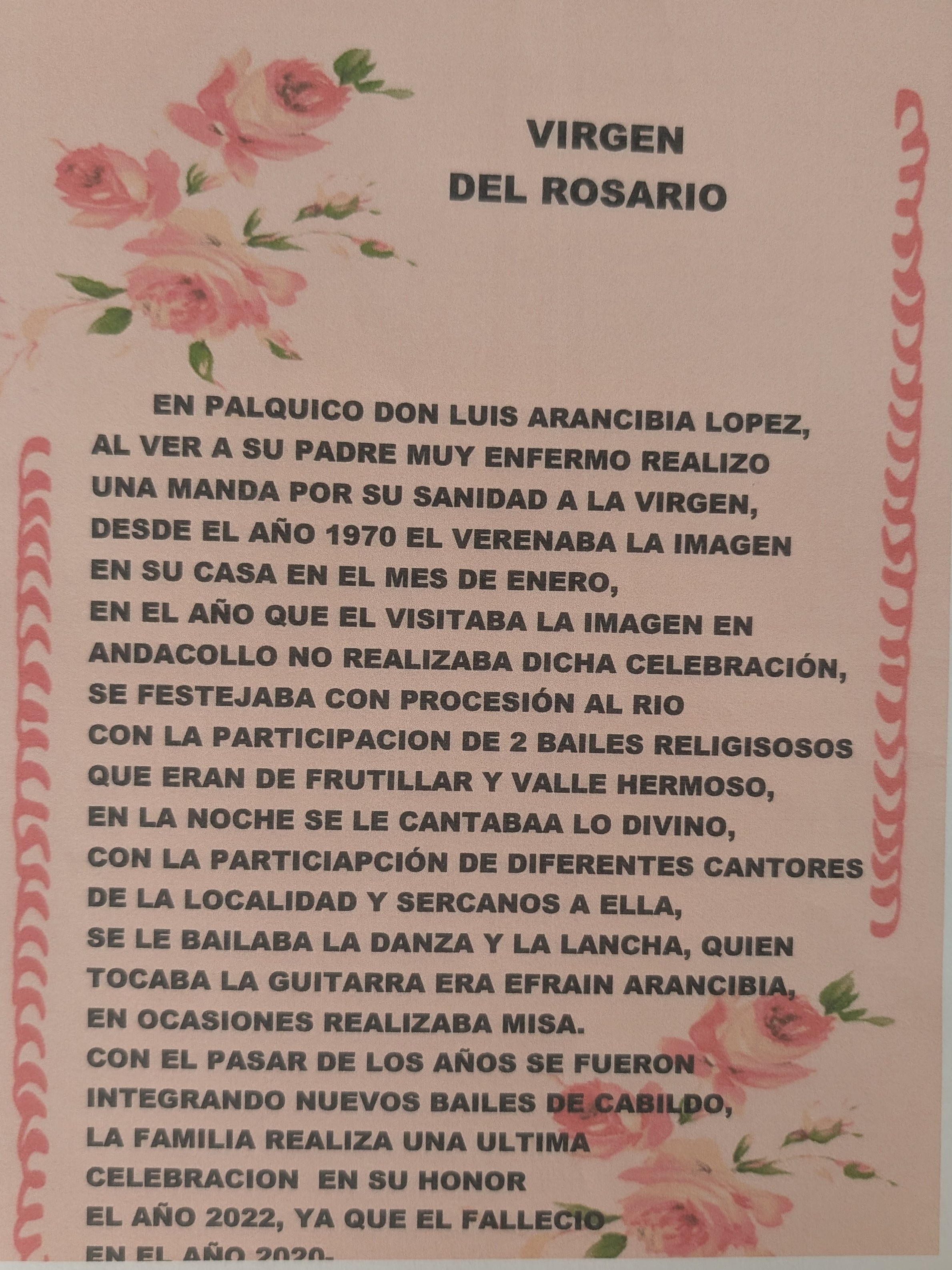 Yo trabajo en un jardín infantil, y acá hicimos un PMI, un mejoramiento a la infancia. Yo les enseñé a los niños el verso de la virgen, y los niños se aprendieron más de la mitad del verso. Y fue emocionante, porque yo les tocaba la guitarra y ellos cantaban. Acá hay mucha gente que baila la danza y la lancha, son dos cosas tradicionales a la virgen.